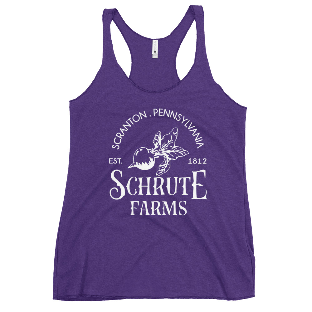Our Schrute Farms racerback tank is soft, lightweight, and form-fitting. It features a flattering cut and raw edge seams for an edgy touch. Dwight would approve! Several colors to choose from.